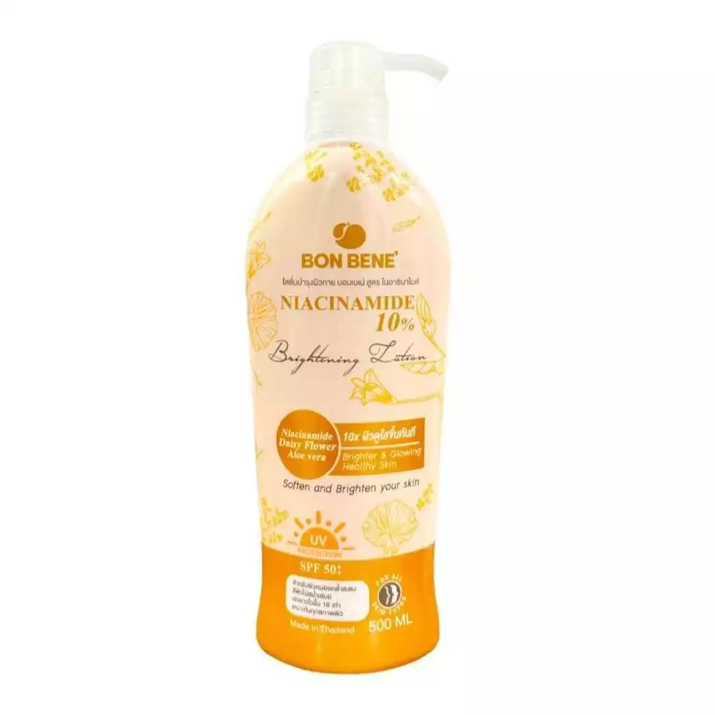 BON BENE NIACINAMIDE WHITENING LOTION WITH SPF 50 Niacimade helps improve uneven skintone,visibly minimize enlarge pores,soften fine lines and wrinkles,diminish dullness if the skin