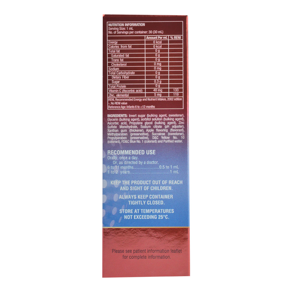 Each ml contains 40 mg of Ascorbic acid (Vit C) and 13.72 mg of Zinc sulfate monohydrate (equivalent to 5 mg elemental Zinc).