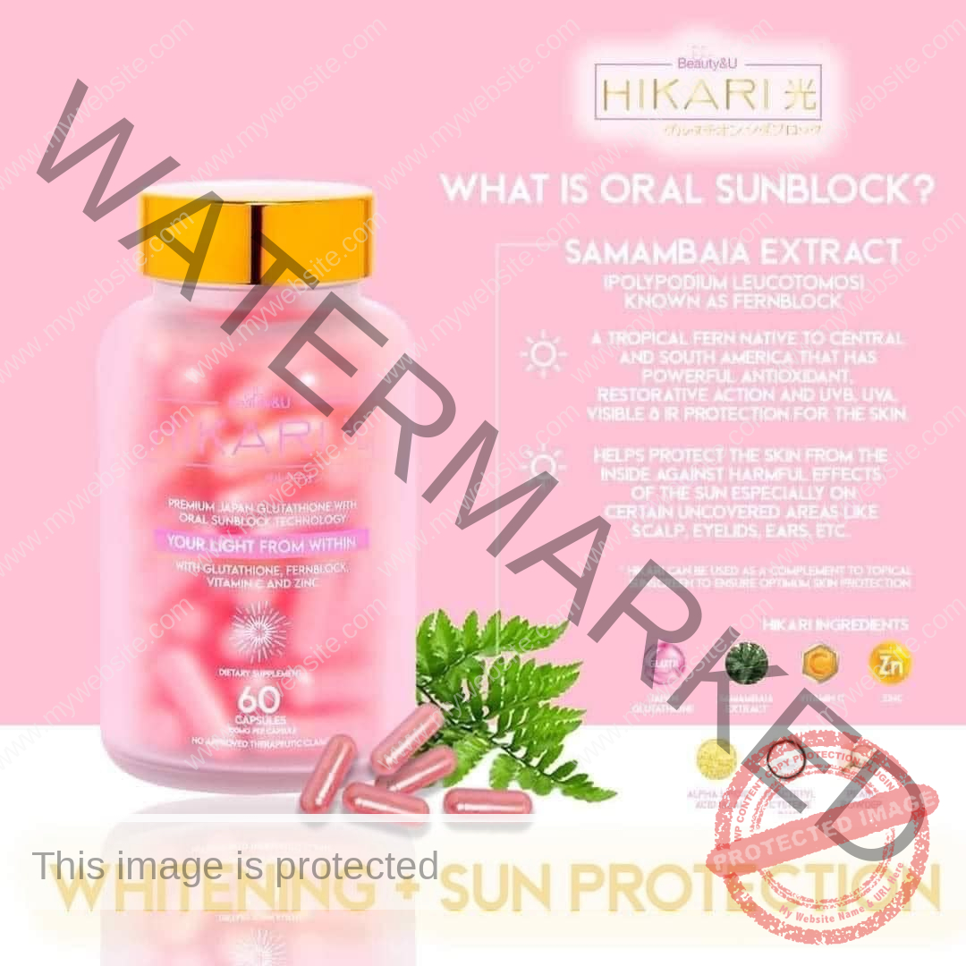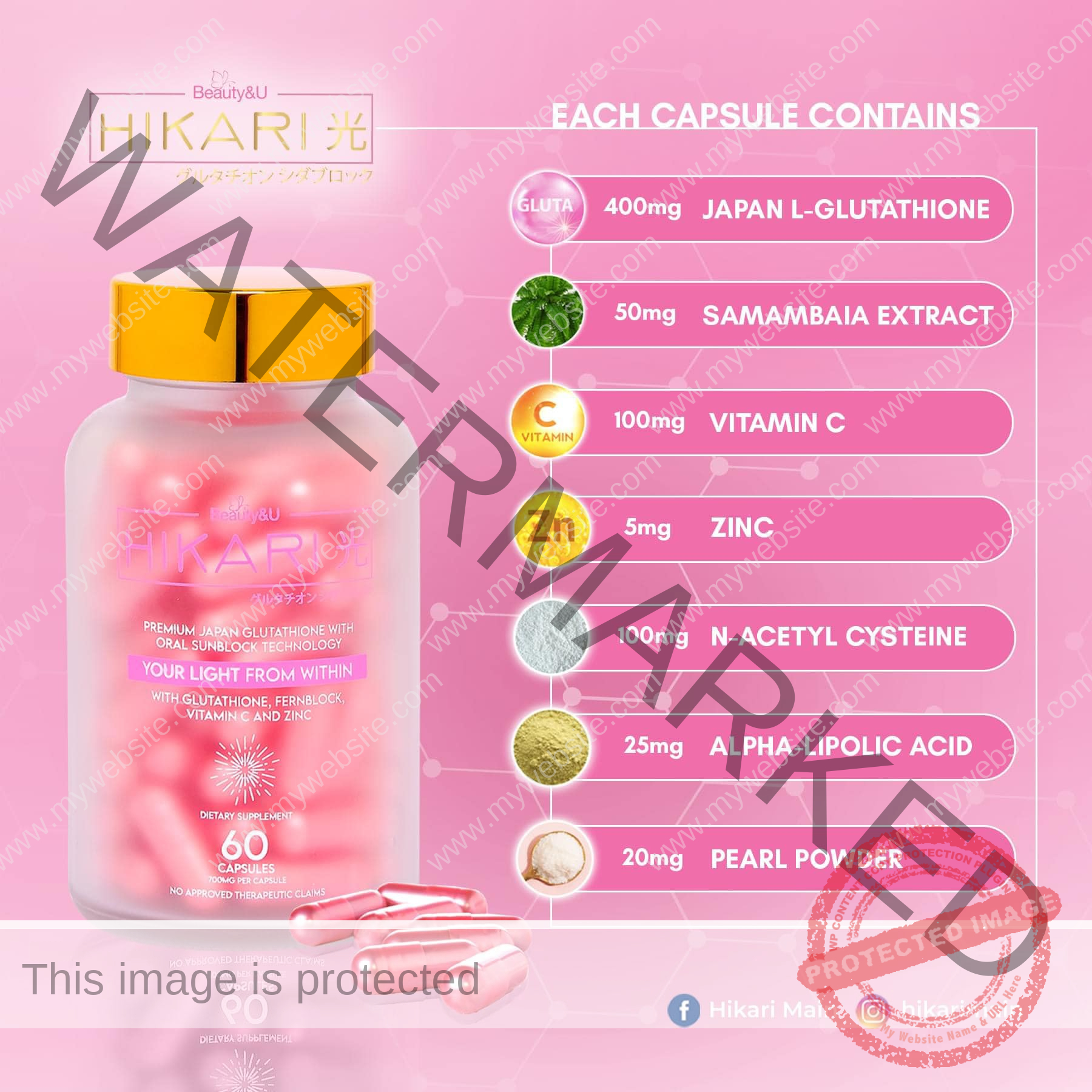 HIKARI Premium Japan Glutathione is a specially formulated oral supplement that lightens your complexion and maintains a healthy and translucent skin while protecting your skin from the inside against the harmful effects of the sun.
