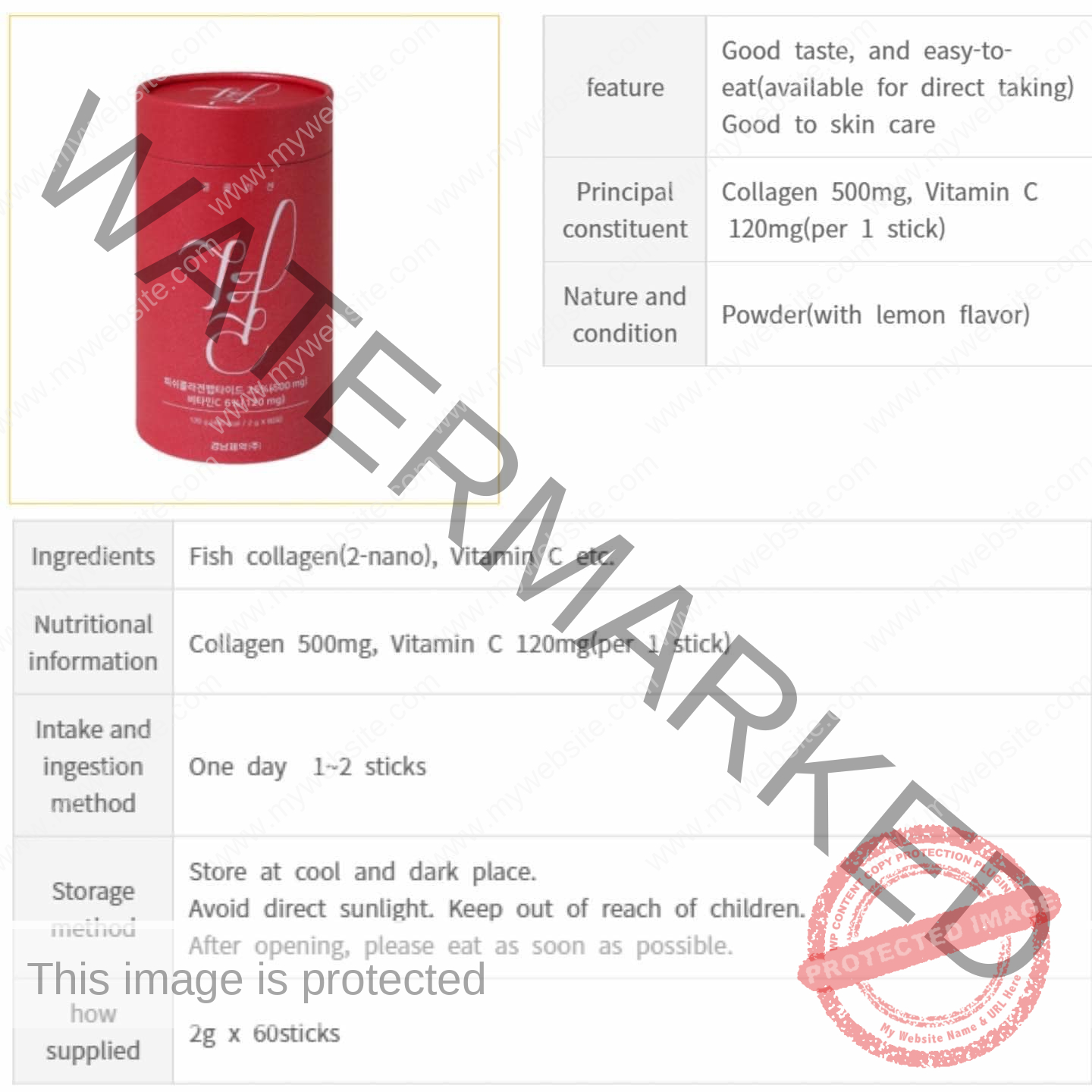 Glucose anhydrocrystalline, Fish collagen, Agave syrup powder, Vitamin C, Xylitol, Lemon flavour powder,