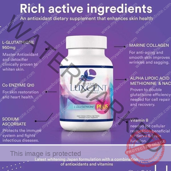 LUXCENT LUMINOUS CAPS is also beneficial for those who have: Fertility problems men and women,fatty liver, stressed, smokers,diabetics,highblood,muscle fatigue,insomnia,eye health,nerve health,low immune system,high cholesterol,brain health, Promotes cell renewal and repair; protects from free radicals to slow down premature skin aging and sagging; unique formula is synergistically combined with essential glutathione boosters and B vitamins; works to encourage cellular metabolism for repair, hydration, and rejuvenation; aids in lightening dark spots and acne marks as it heals dry, damaged skin; helps minimizes the look of fine lines and wrinkles; formulated in Japan
