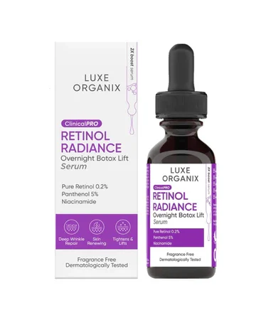 Luxe Organix ClinicalPRO Retinol Radiance Overnight Botox Lift Serum is formulated with 0.2% Pure Retinol, a powerful anti-aging active that effectively promotes skin cell renewal to reveal a more youthful & glowing skin. It helps smoothen fine lines & wrinkles while restoring skin elasticity to keep skin firm and supple. With additional benefits from Panthenol & Niacinamide to lock in moisture while helping to repair and soothe the skin barrier.