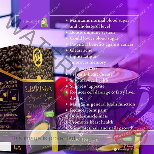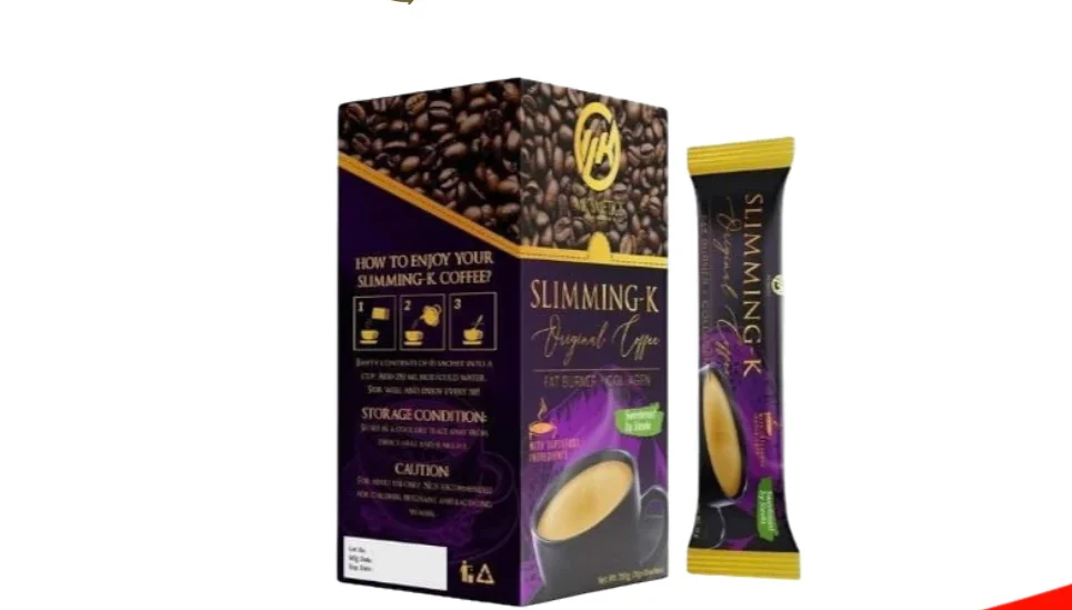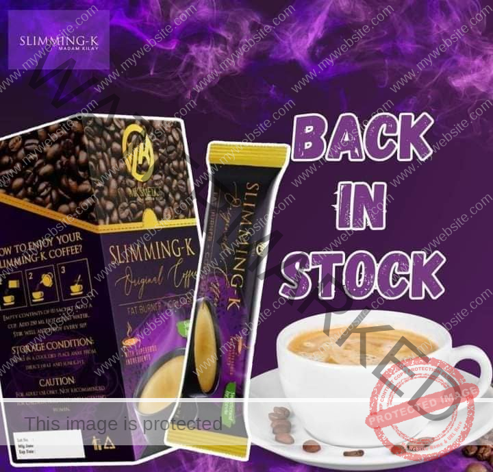 SLIMMING-K Coffee by Madam Kilay, Fat Burner + Collagen Mix Drinks – 21g x 10 Sachets Ingredients: Coffee, Non-dairy creamer, Stevia, L-Carnitine, Garcinia Cambogia, Collagen, Panax Ginseng, Aloe Vera Extract, African Mango Extract, L-Glutathione. Directions: Empty contents of one sachet into a glass. Pour 150ml of cold or hot water and stir until completely dissolved. For best results, drink warm water first thing in the morning then Slimming-K coffee 30 minutes before a meal. Can be taken up to 4x a day. Results may vary from person to person. NO APPROVED THERAPEUTIC CLAIMS.