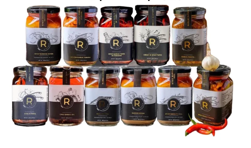 | Flavour | Chili Garlic Oil, Burong Isda, Spicy Burong Isda, Burong Hipon, Spicy Burong Hipon, Garlic Tinapa, Spicy Garlic Tinapa, Lemon Garlic Tinapa, Garlic Tuyo, Sweet & Spicy Tuyo, Spicy Garlic Tuyo in Vinegar, Adobong Tinapa, Spicy Adobong Tinapa |