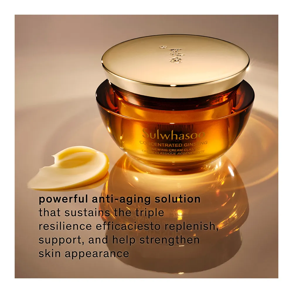 What it is:An anti-ageing cream with a silky rich cream texture that cares for comprehensive signs of ageing for healthier-looking skin.What it does:This powerful anti-ageing cream sustains triple resilience-boosting efficacies of Sulwhasoo’s unique Ginsenomics™ to replenish, support, and help strengthen skin day after day to reveal ageless skin. The silky rich texture gently envelops the skin immediately upon application with a nourishing sensation to deliver youthful, dewy skin. Ginsenomics™ is a powerful, active beauty Ginsenoside developed by Sulwhasoo to help minimise visible signs of aging. Sulwhasoo enriches the rarest type of Ginseng Saponin more than 6,000 times to produce Ginsenomics™. It enhances your skin’s ability to regenerate and keep it looking firm and resilient against any external aggressors, helping to reduce wrinkles that have appeared on your skin.What else you need to know: